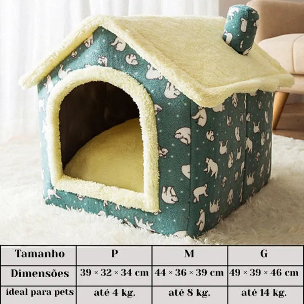 Fabricada com veludo ártico, esponja e algodão PP, a casinha mantém a temperatura ideal e o formato original mesmo após muitas lavagens.